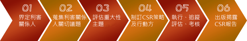 CSR委員會由各部門一級主管組成,依據公司營業活動並參考GRI Standreds準則,了解利害關係人對經濟面、環境面、社會面等關切議題進行重要性評分,製作問卷放置於公司網站,由利害關係人上網填寫並統計,最後由委員會秘書彙整,並由委員會開會討論確認重大主題,並依此制訂公司未來相關行動方案與CSR 策略。