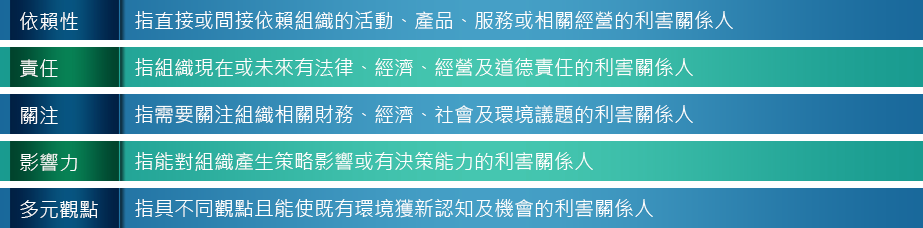 CSR 委員會參酌各部門及同業的經驗,並參考AA1000 SES-2011利害關係人議合標準(Stakeholder Engagement Standard,SES),根據五大原則(依賴性、責任、關注、影響力、多元觀點)鑑別主要利害關係人共八類:股東、客戶或貿易商、員工及工會、供應商、社區或地方團體、中央或地方政府、同業或專業團體、協力人員。